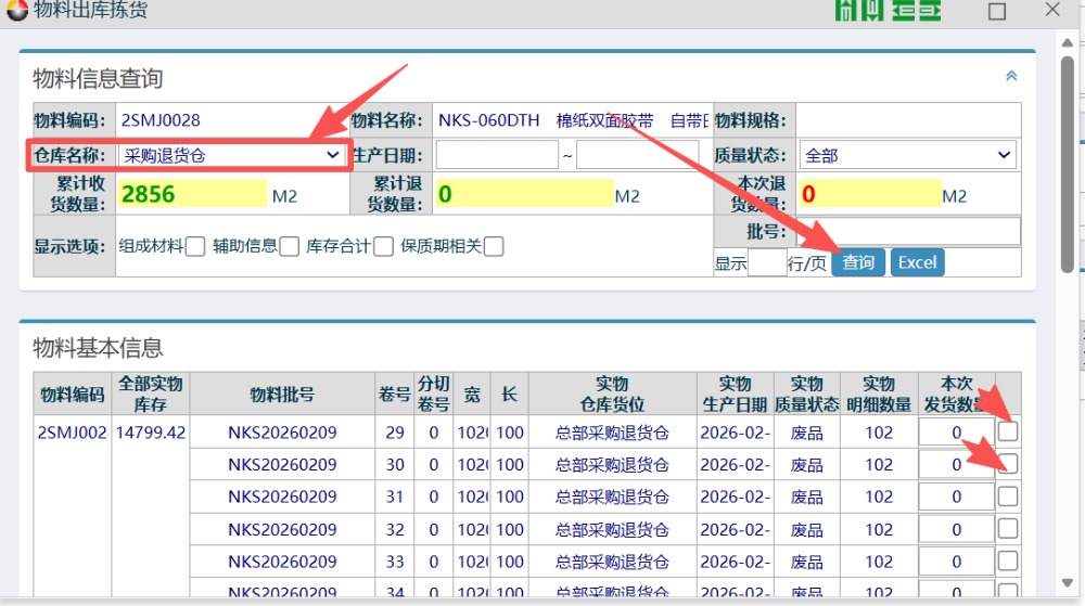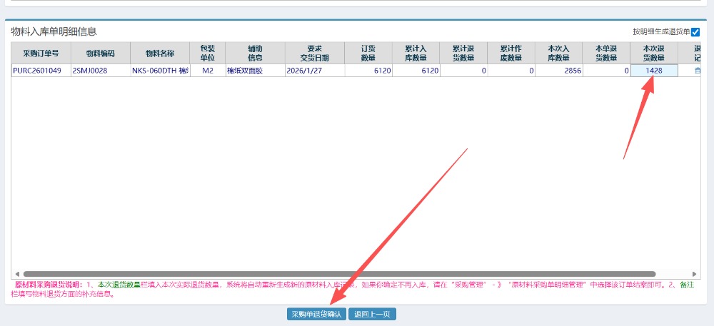操作步骤:仓库管理-物料出库管理-采购退货出库-新增采购退货单