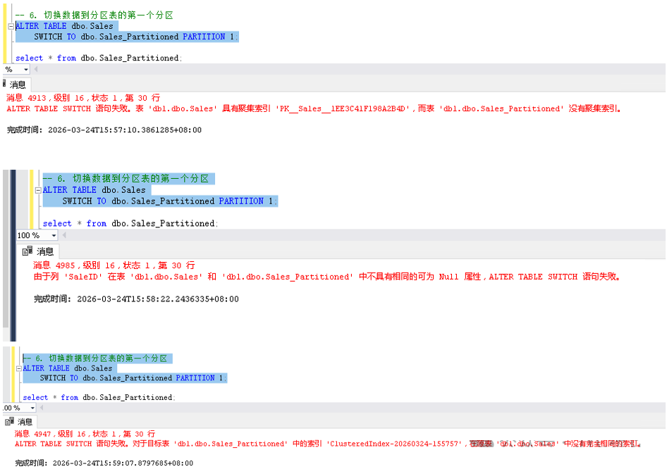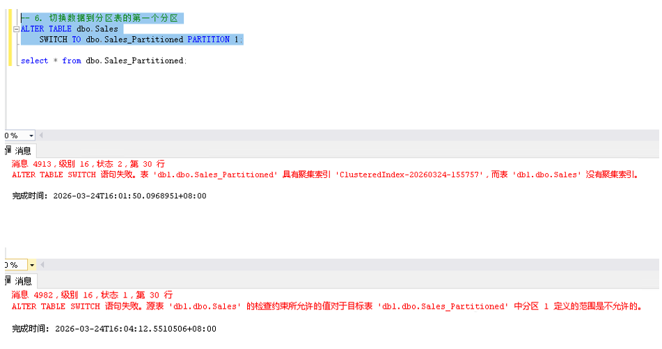 约束要求:普通表需添加 CHECK约束,限制分区键范围与目标分区一致(分区切换时 SQL Server 会检查约束)。
