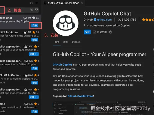 - 扩展商店搜:GitHub Copilot + GitHub Copilot Chat(安装)