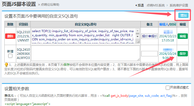 为了给点晴MIS系统任意页面增加自定义JS函数及操作脚本功能,并支持JS直接提取SQLServer数据库后台数据参与运算或赋值显示,需要用到如下几个页面:/MIS/ajax_data/set_page_js.asp-----》用于设置相关JS参数/MIS/ajax_data/get_field_value.asp---...
