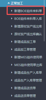 点晴ERP-新增BOE组件来料单 1.进入ERP系统之后,在左侧的功能菜单里下方可以找到“BOE定制”,点击后找到“正常加工”。然后点击打开“新增BOE组件来料单”。2.进入“新增BOE组件来料单”界面后,先填写好基本的信息:入库仓库、收货日期。 以及有需要的话可以根据情况填写来料的备注信息。 3.填写B...