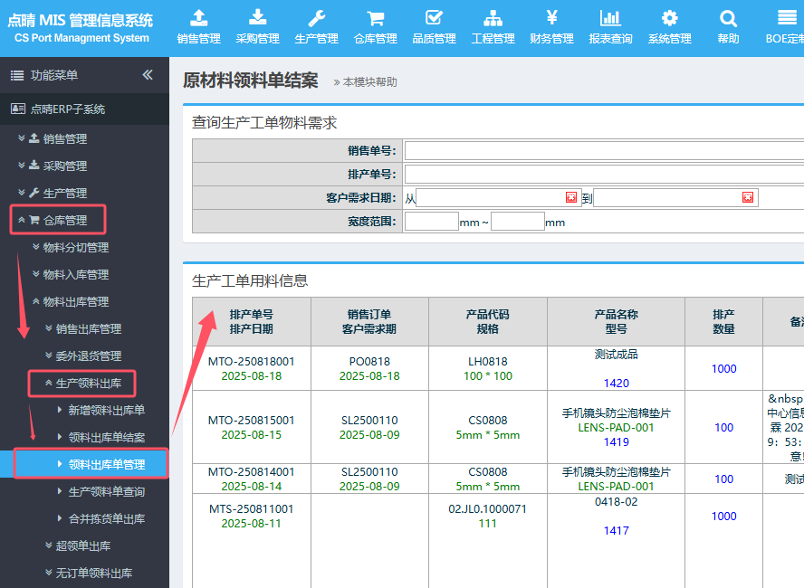 【点晴模切ERP】如何查询生产工单已出库的领料单明细信息?​进入:仓库管理-》生产领料出库-》领料出库单管理就可以查到所有生产工单的领料单明细信息了。
