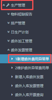点晴ERP-委外费用异常单-操作流程 进入ERP系统之后,在左侧的功能菜单里找到“生产管理”,点开“委外发票管理”,点击“新增委外费用异常单”。 2.进入界面后,选择对应供应商以及费用类型。 3.来到下方选择“物料编码”,点击后会弹出物料信息窗口。 在弹窗物料信息界面内,按图操作:选择对应物料大类,...