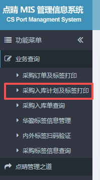 操作步骤:仓库管理——物料入库管理——采购入库管理——采购入库单管理;进入页面如下图所示:​在此页面可进行采购入库记录查询,标签打印,以及单据打印。