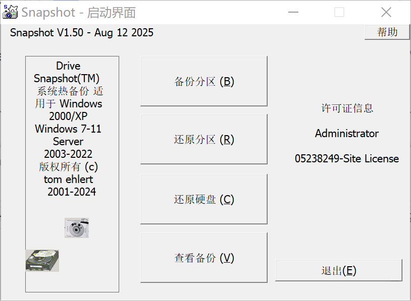 今天给分享一款小巧强大的系统备份还原软件--DriveSnapShot,v1.50.0.1744新版本(2025.08.12)。大小仅3MB,中文绿色便携版。支持Windows2000/XP,Windows7-11,Server2003-2022。支持磁盘卷热备份还原、差异备份、增量备份、异机还原、远程备份、RAID磁...