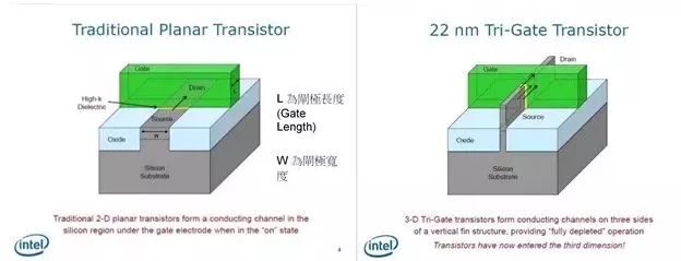 三星以及台积电在先进半导体制程打得相当火热,彼此都想要在晶圆代工中抢得先机以争取订单,几乎成了 14 纳米与 16 纳米之争,然而 14 纳米与 16 纳米这两个数字的究竟意义为何,指的又是哪个部位?而在缩小制程后又将来带来什么好处与难题?以下我们将就纳米制程做简单的说明。 纳米到底有多细微? 在开始之前,要先了解纳米究竟是什么意思。在数学上,纳米是 0.000000001 公尺,但这是个相当差的例子,毕竟我们只看得到小数点后有很多个零,却没有实际的感觉。如果以指甲厚度做比较的话,或许会比较明显。 用尺规实际测量的话可以得知指甲的厚度约为 0.0001 公尺(0.1 毫米),也就是说试着把一片指甲的侧面切成 10 万条线,每条线就约等同于 1 纳米,由此可略为想像得到 1 纳米是何等的微小了。 知道纳米有多小之后,还要理解缩小制程的用意,缩小电晶体的最主要目的,就是可以在更小的芯片中塞入更多的电晶体,让芯片不会因技术提升而变得更大;其次,可以增加处理器的运算效率;再者,减少体积也可以降低耗电量;最后,芯片体积缩小后,更容易塞入行动装置中,满足未来轻薄化的需求。 再回来探究纳米制程是什么,以 14 纳米为例,其制程是指在芯片中,线最小可以做到 14 纳米的尺寸,下图为传统电晶体的长相,以此作为例子。缩小电晶体的最主要目的就是为了要减少耗电量,然而要缩小哪个部分才能达到这个目的?左下图中的 L 就是我们期望缩小的部分。藉由缩小闸极长度,电流可以用更短的路径从 Drain 端到 Source 端(有兴趣的话可以利用 Google 以 MOSFET 搜寻,会有更详细的解释)。 (Source:http://www.slideshare.net) 此外,电脑是以 0 和 1 作运算,要如何以电晶体满足这个目的呢?做法就是判断电晶体是否有电流流通。当在 Gate 端(绿色的方块)做电压供给,电流就会从 Drain 端到 Source 端,如果没有供给电压,电流就不会流动,这样就可以表示 1 和 0。(至于为什么要用 0 和 1 作判断,有兴趣的话可以去查布林代数,我们是使用这个方法作成电脑的) 尺寸缩小有其物理限制 不过,制程并不能无限制的缩小,当我们将电晶体缩小到 20 纳米左右时,就会遇到量子物理中的问题,让电晶体有漏电的现象,抵销缩小 L 时获得的效益。作为改善方式,就是导入 FinFET(Tri-Gate)这个概念,如右上图。在 Intel 以前所做的解释中,可以知道藉由导入这个技术,能减少因物理现象所导致的漏电现象。 (Source:http://www.slideshare.net) 更重要的是,藉由这个方法可以增加 Gate 端和下层的接触面积。在传统的做法中(左上图),接触面只有一个平面,但是采用 FinFET(Tri-Gate)这个技术后,接触面将变成立体,可以轻易的增加接触面积,这样就可以在保持一样的接触面积下让 Source-Drain 端变得更小,对缩小尺寸有相当大的帮助。 最后,则是为什么会有人说各大厂进入 10 纳米制程将面临相当严峻的挑战,主因是 1 颗原子的大小大约为 0.1 纳米,在 10 纳米的情况下,一条线只有不到 100 颗原子,在制作上相当困难,而且只要有一个原子的缺陷,像是在制作过程中有原子掉出或是有杂质,就会产生不知名的现象,影响产品的良率。 如果无法想像这个难度,可以做个小实验。在桌上用 100 个小珠子排成一个 10×10 的正方形,并且剪裁一张纸盖在珠子上,接着用小刷子把旁边的的珠子刷掉,最后使他形成一个 10×5 的长方形。这样就可以知道各大厂所面临到的困境,以及达成这个目标究竟是多么艰巨。 随着三星以及台积电在近期将完成 14 纳米、16 纳米 FinFET 的量产,两者都想争夺 Apple 下一代的 iPhone 芯片代工,我们将看到相当精彩的商业竞争,同时也将获得更加省电、轻薄的手机,要感谢摩尔定律所带来的好处呢。