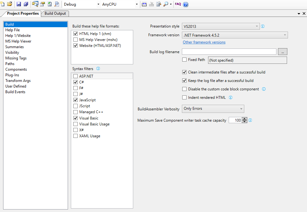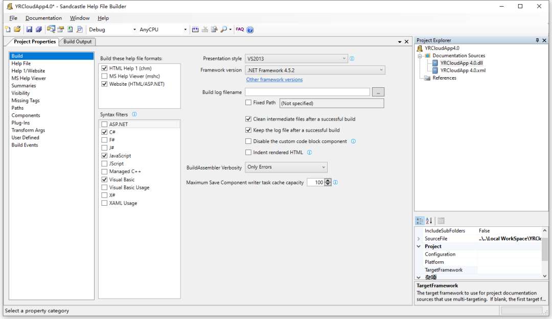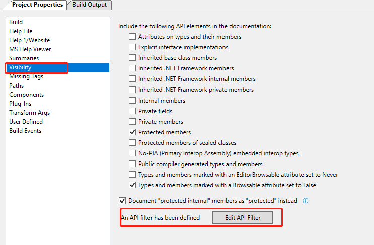 ![]() 二、下载安装下载地址: Help File Builder and Tools v2021.4.9.0最新版本 下载链接:https://github.com/EWSoftware/SHFB/releases 单纯Sandcastle好像是没有界面的, 这个链接提供的下载可以包含图形界面。 注意:如果需要生成chm还需要微软的 MicrosoftHTMLHelpWorkshop 支持,Sandcastle生成时会自动去查找MicrosoftHTMLHelpWorkshop 的安装目录。 安装: 安装很简单,两个软件都只需要直接点击“下一步”即可安装完成。 三、Sandcastle配置安装好软件后可以根据自己的需要配置相应的参数。 ![]() 默认情况下dll中所有方法和属性都会生成对应文档,也可以根据自己需要只把DLL中需要的类或方法生成文档,可通过如下图配置: ![]() 在左侧把需要的类或方法勾选就行了: ![]() 在使用工具生成文档前,别忘了在VS中要作简单配置,才能生成DLL对应的XML配置文件,vs配置方法如下: 在VS中右键项目属性: 把"XML documentation file:"勾选,当编译时在生成DLL的同时还会生成一个和dll同名的xml配置文件。 在Sandcastle中右侧窗口右键将需要生成文档的dll和对应的xml添加进来: