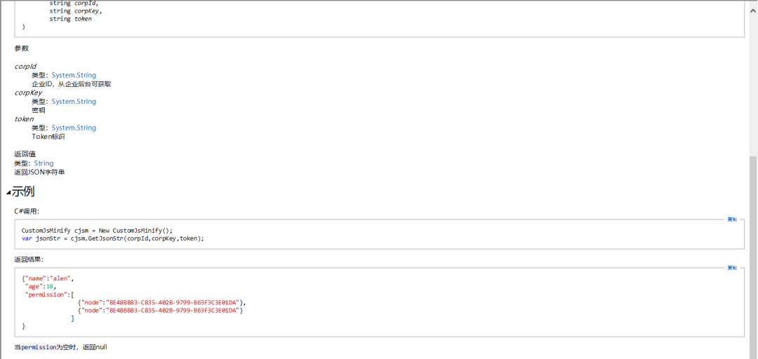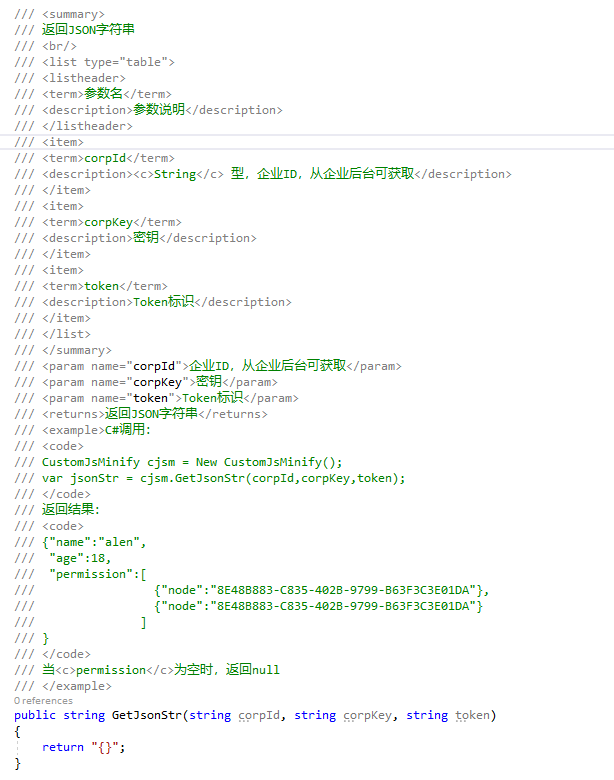 ![]() 这个按钮就可以自动生成文档了。 四、C#注释规范为了生成友好的帮助文档,注释规范自然少不了,以下是关于C#的注释规范以及各参数的说明,注释越详细,生成的文档可读性越好: 1、C#注释标记: ![]() 大家对注释应该都不陌生,在方法或者类前面三个斜杠就自动添加了常用的注释标记,如下图: ![]() 但是如果想要得到更加友好的帮助文档,注释得花点心思。 如文章开头所展示的帮助文档,部分方法的注释如下: ![]() 2、C#注释标记说明: A.2.1 此标记提供一种机制以指示用特殊字体(如用于代码块的字体)设置说明中的文本段落。对于实际代码行,请使用 (第 A.2.2 节)。 语法:text 示例:
