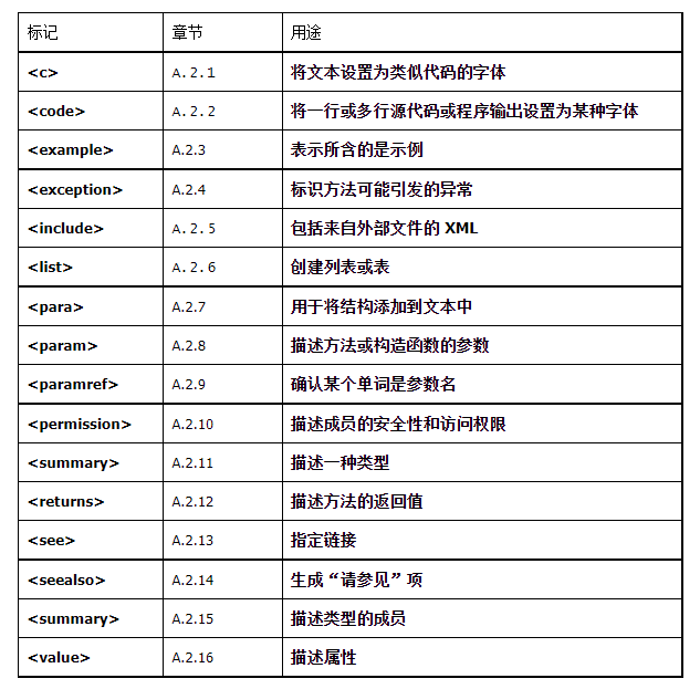 A.2.3 此标记用于在注释中插入代码示例,以说明如何使用所关联的方法或其他库成员。通常,此标记是同标记 (第 A.2.2 节)一起使用的。 语法:description 示例: 有关示例,请参见 (第 A.2.2 节)。 A.2.4 此标记提供一种方法以说明关联的方法可能引发的异常。 语法:description 其中cref="member" 成员的名称。文档生成器检查给定成员是否存在,并将 member 转换为文档文件中的规范元素名称。description 对引发异常的情况的描述。 示例:
