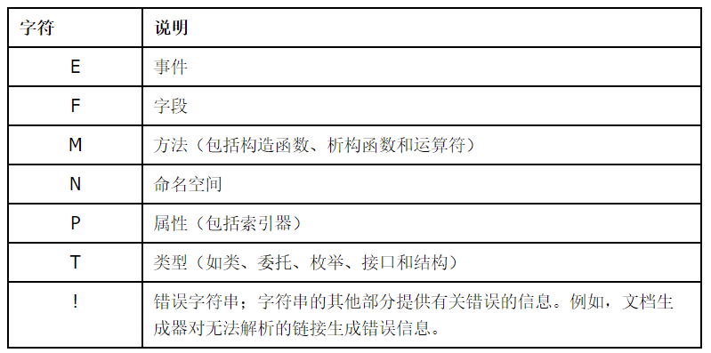 A.3. 处理文档文件 文档生成器为源代码中每个附加了“文档注释标记”的代码元素生成一个 ID 字符串。该 ID 字符串唯一地标识源元素。文档查看器利用此 ID 字符串来标识该文档所描述的对应的元数据/反射项。 文档文件不是源代码的层次化表现形式;而是为每个元素生成的 ID 字符串的一维列表。 A.3.1. ID 字符串格式 文档生成器在生成 ID 字符串时遵循下列规则: 不在字符串中放置空白。 字符串的第一部分通过单个字符后跟一个冒号来标识被标识成员的种类。定义以下几种成员: 字符串的第二部分是元素的完全限定名,从命名空间的根开始。元素的名称、包含着它的类型和命名空间都以句点分隔。如果项名本身含有句点,则将用 # (U+0023) 字符替换。(这里假定所有元素名中都没有“# (U+0023)”字符。) 对于带有参数的方法和属性,接着是用括号括起来的参数列表。对于那些不带参数的方法和属性,则省略括号。多个参数以逗号分隔。每个参数的编码都与 CLI 签名相同,如下所示:参数由其完全限定名来表示。例如,int 变成 System.Int32、string 变成 System.String、object 变成 System.Object 等。具有 out 或 ref 修饰符的参数在其类型名后跟有 @ 符。对于由值传递或通过 params 传递的参数没有特殊表示法。数组参数表示为 [ lowerbound : size , … , lowerbound : size ],其中逗号数量等于秩减去一,而下限和每个维的大小(如果已知)用十进制数表示。如果未指定下限或大小,它将被省略。如果省略了某个特定维的下限及大小,则“:”也将被省略。交错数组由每个级别一个“[]”来表示。指针类型为非 void 的参数用类型名后面跟一个 *的形式来表示。void 指针用类型名 System.Void 表示。 A.3.2. ID 字符串示例 下列各个示例分别演示一段 C# 代码以及为每个可以含有文档注释的源元素生成的 ID 字符串: 类型用它们的完全限定名来表示。