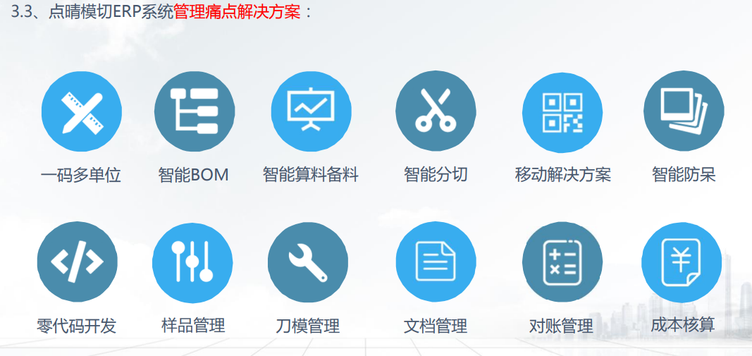 点晴模切ERP系统深耕模切行业20年余年,已为多家模切企业提供了完善的解决方案。点晴模切ERP系统在模切行业的广度与深度方案有着独到见解,从而真正为企业做到降本增效的效果。