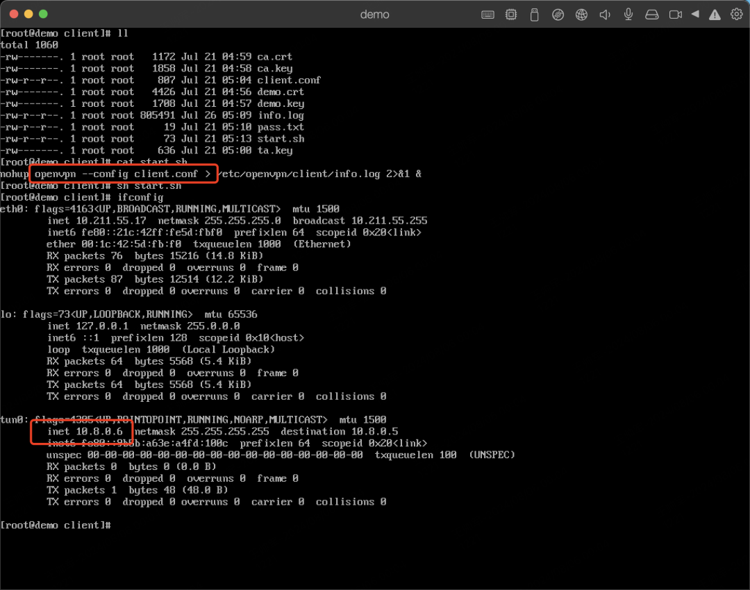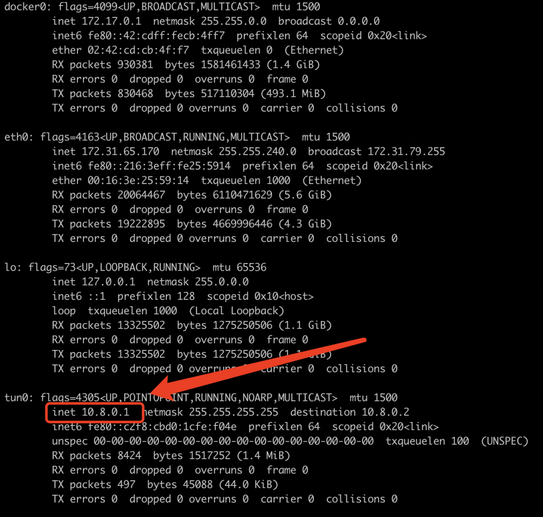 到这里我们的服务端就搭建好了,使用ifconfig可以看到我们的服务端已经给自己分配了一个10.8.0.1的虚拟IP