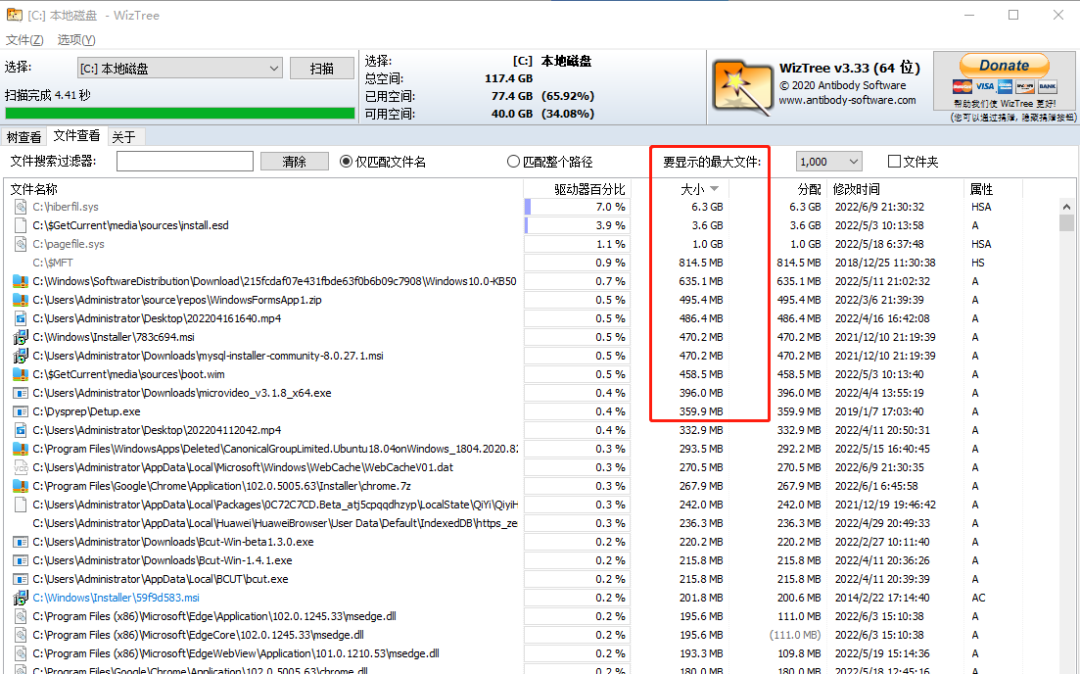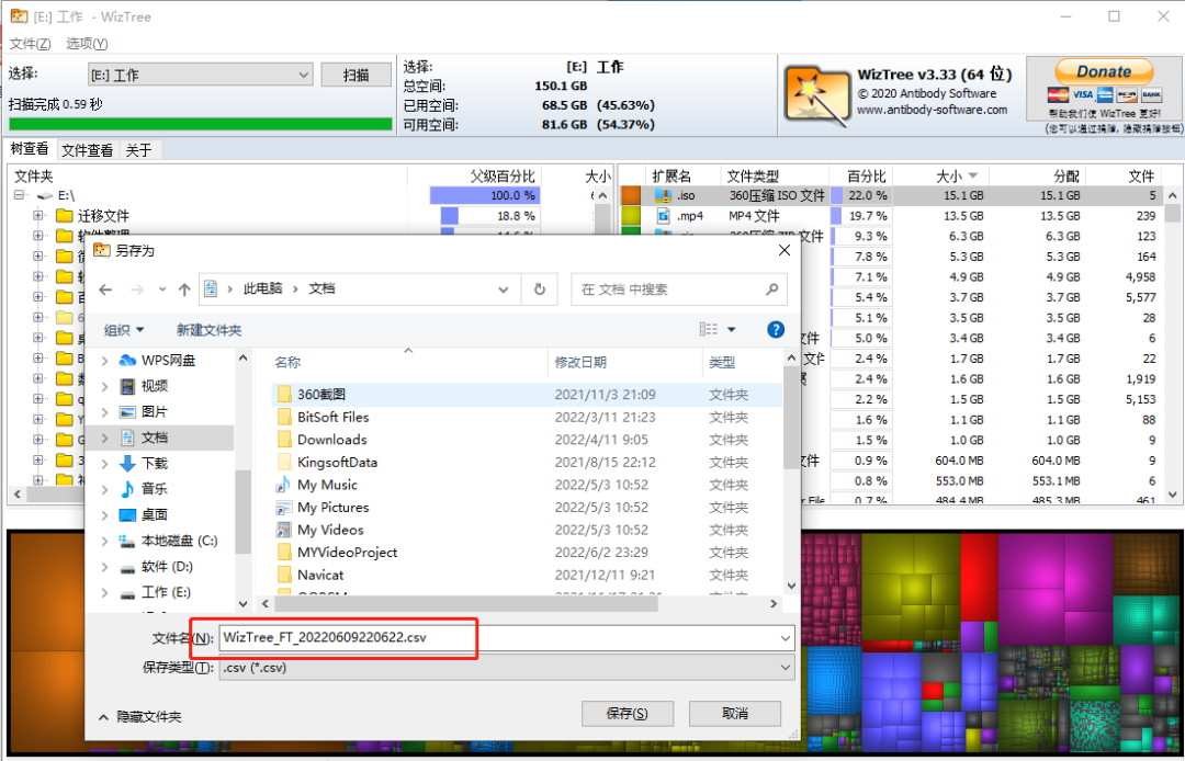 平常我们在用电脑的时候,随着时间越来越久电脑系统盘就爆红了,这时候想快速找到大文件,然后快速清理掉,从而给电脑系统盘瘦身,不知道从何处下手,今天小编就给大家分享一款免费的电脑磁盘空间利用率分析工具——WizTree,可以很方便的解决磁盘文件清理的问题,大家一起来看看吧! 1、WizTree是啥?WizTree 是一款Windows下磁盘空间分析工具。它可以快速扫描并分析你的电脑硬盘驱动器中文件和文件夹,并以可视化块状的方式展示哪些文件和文件夹使用的磁盘空间最多。这样你就可以很方便找到占用磁盘空间大的文件。 注意:删除系统盘文件的时候,要谨慎一些,确保能删除的文件再进行删除,避免误删系统文件,造成操作系统不可恢复的情况。 2、WizTree的特点 2.1 磁盘空间利用率分析选择磁盘驱动器,可以快速扫描分析硬盘空间占用的情况,并可自由选择删除文件和文件夹用来释放磁盘空间。 2.2 扫描速度快WizTree 工具是直接从 NTFS 格式的驱动器读取主文件表 (MFT)(类似于 Everything Search Engine 的工作方式),速度非常快。 2.3 支持多文件系统格式 WizTree 可以扫描 Windows 支持的所有硬盘类型(NTFS、FAT、FAT32、网络等)。也支持外接的移动硬盘、U盘、相机等存储设备。 2.4 树状图显示 可视化树状图根据大小直观地显示所有文件和文件夹。这样大家可以一目了然地发现大文件和大量较小文件的集合。 2.5 大文件快速查找 “文件视图”选项卡可以按文件大小顺序列出硬盘驱动器上的每个单独文件和文件夹。 2.6 支持文件名模糊搜索 使用文件视图搜索过滤器按名称或类型快速定位文件。还支持通配符搜索(例如 *.mp3) 2.7 支持导出文件和 MFT 数据 所有或选定的文件信息可以导出到 CSV(逗号分隔值)文件或复制到剪贴板。可以提取 MFT 文件并将其转储到文件中。