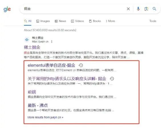 7.数据结构化标记结构化数据标记并不能直接帮助提高搜索排名,但它能带来很多好处: (1)丰富搜索结果比如搜索 掘金 出现的页面,红色框部分就是结构化标记的成果,从框内可以更好的了解该网站的内容,而且占据了大版面也有利于吸引用户注意。 (2)拥有知识面板在右侧会有个知识面板,该面版可提供更高的品牌知名度和权威性,如下图的右侧红框: (3)支持语义搜索不再是关键词的匹配搜索,而是通过关键词去寻找问题的答案。当你搜索如下模糊内容时,Google 会通过这种方式设法返回合适的结果: (4)体现 E-A‑TE‑A-T 意思 是专业(Expertise), 权威(Authoritativeness)和可信(Trustworthiness)的缩写, E-A-T是谷歌算法的一部分,并被写入谷歌搜索质量评估指南中。 结构化数据形式结构化数据有三种形式:JSON-LD,Microdata和RDFa。个人之前一直用的JSON-LD,如下: