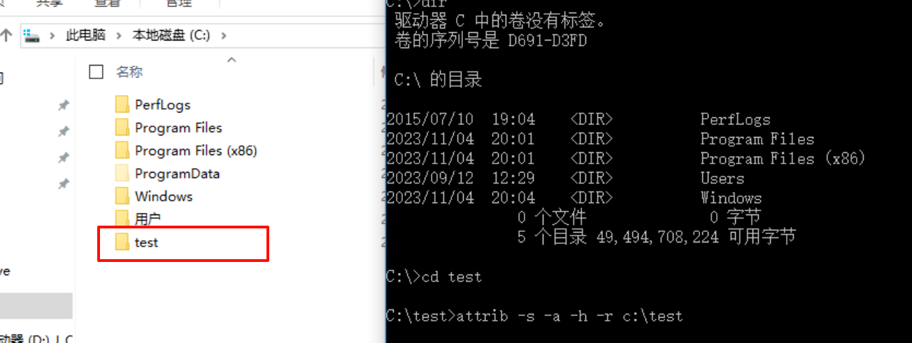 命令执行后,我们并看不到 test 目录,但是他是存在的,也是可以进入的