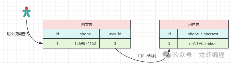 如果要查询186手机号开头的用户信息,首先通过186手机号在明文表中查询对应的用户id,然后通过用户id去用户表中查询对应的用户数据。