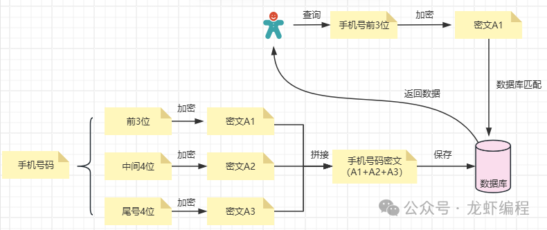 查询的时候,假设业务人员通过手机号码的前3位置查询,那么我们将前3位加密后得到密文A1,通过密文A1去模糊匹配得到结果。