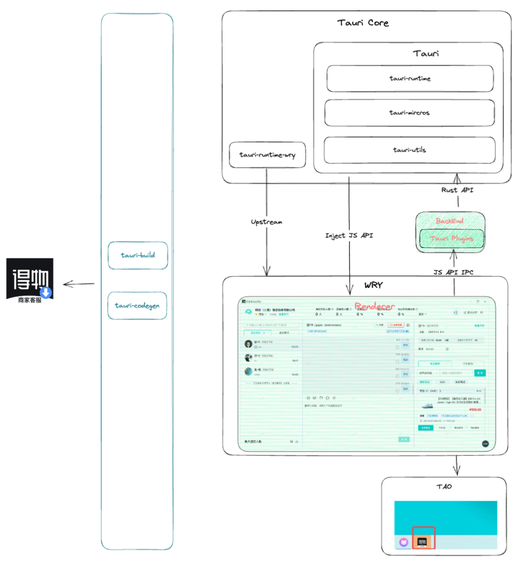 那么,Tauri的基础架构模型是什么样的?其实官网对这块的介绍比较有限,但是我们可以通过其源码仓库和代码结构管中窥豹的了解Tauri的核心架构模型,为了方便大家理解,我们以得物商家客服桌面端应用为模型,简单的画了一个草图: