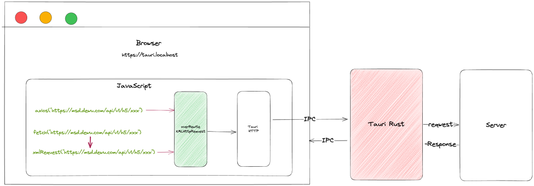 • Tauri的渲染进程则是运行在操作系统的Webview当中的,我们可以直接通过JS + HTML + CSS来编写,同时,Tauri会为渲染进程注入一些全局的JS API函数。比如fs、path、shell等等。