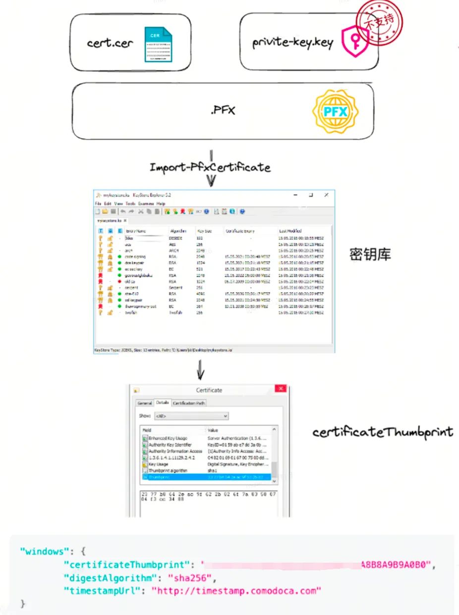 "windows": {    // 签名指纹    "certificateThumbprint": "xxx",    // 签名算法    "digestAlgorithm": "sha256",    // 时间戳    "timestampUrl": "http://timestamp.comodoca.com"}