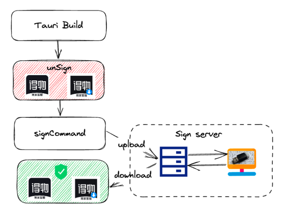 不过对于我们而言,USB key签名狗是整个公司共享的,通常不在前端开发手里(尤其是异地办公)。一种做法是在Tauri构建的过程中,对于需要签名的软件提供一个signCommand命令钩子,并为这个命令传入文件的路径,然后交由开发者对文件进行自行签名(比如上传到拥有签名工具的电脑,上传上去后,远程进行签名,签名完成再下载)。所以这就需要让Tauri将签名功能暴露出来,让我们自行进行签名,比如这样: