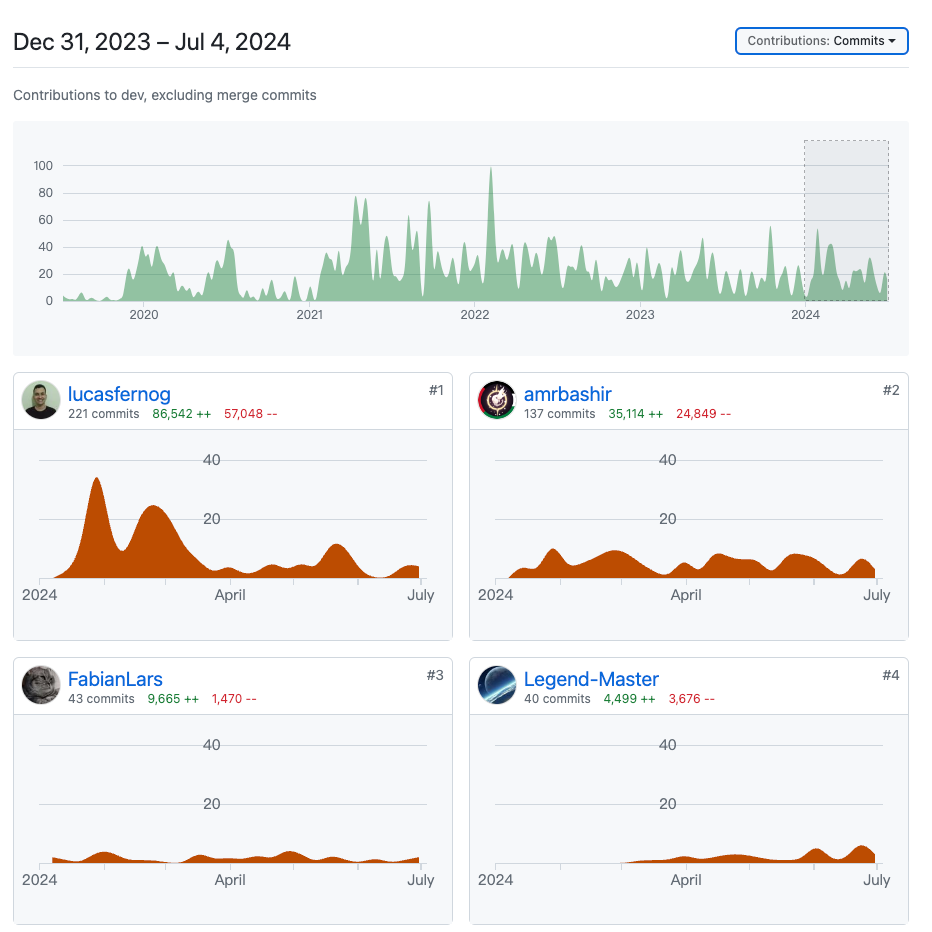 比如,Tauri: dev分支上,主要贡献者(> 30 commit)只有4个人;相对于Electron:主要贡献者有10人。