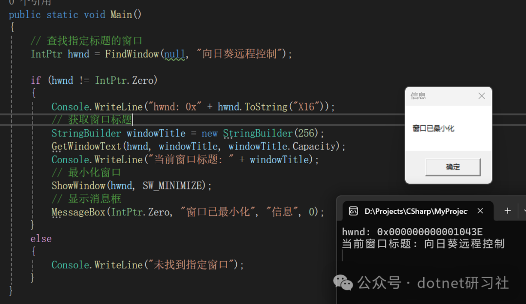 以下是一个完整的示例,展示如何通过调用 Win32 API 获取窗口的标题,最小化窗口,并显示消息框。