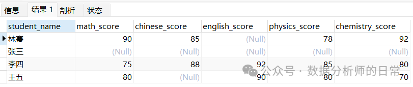 insert into data_learning.student_scores values('林赛'9085NULL7892),   -- 林赛,缺考英语('张三'NULLNULLNULLNULLNULL),  -- 张三,全缺考('李四'7588928580),   -- 李四,全科参考('王五'80NULL908070);     -- 王五,缺考语文