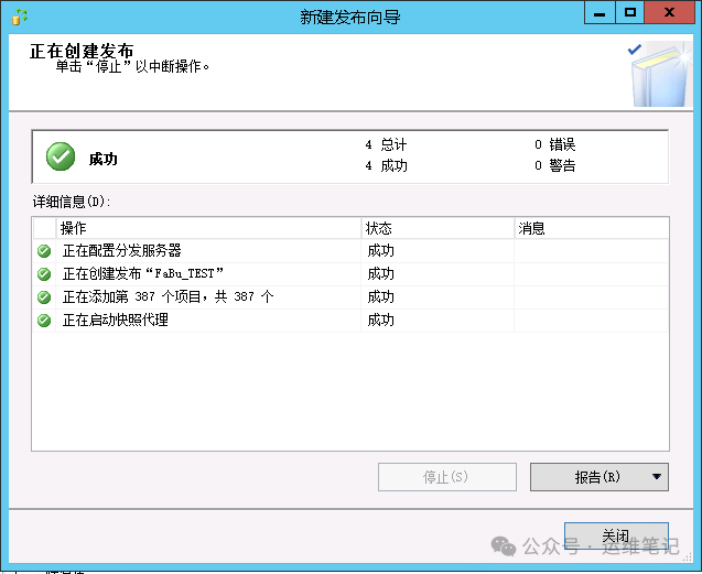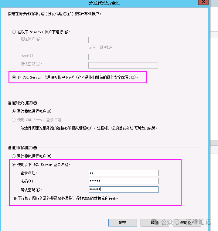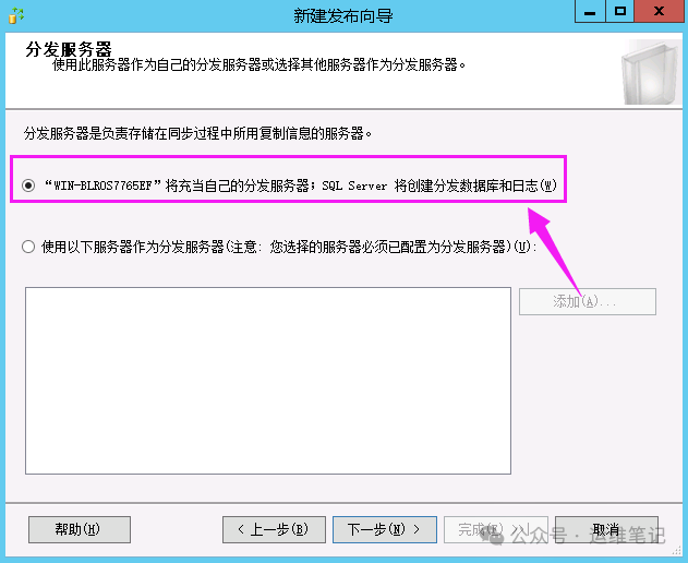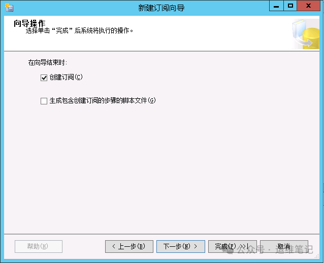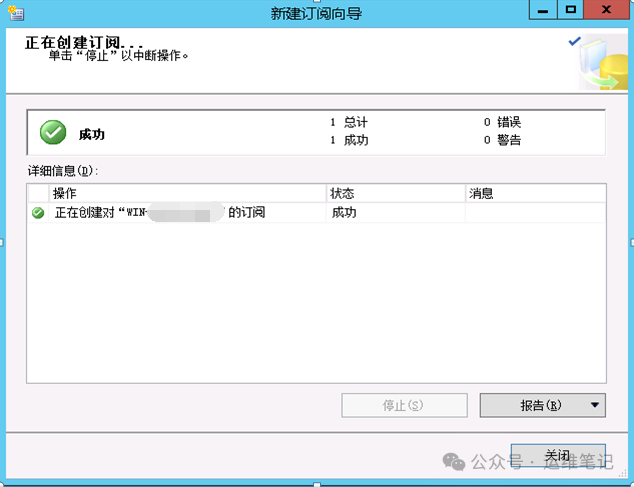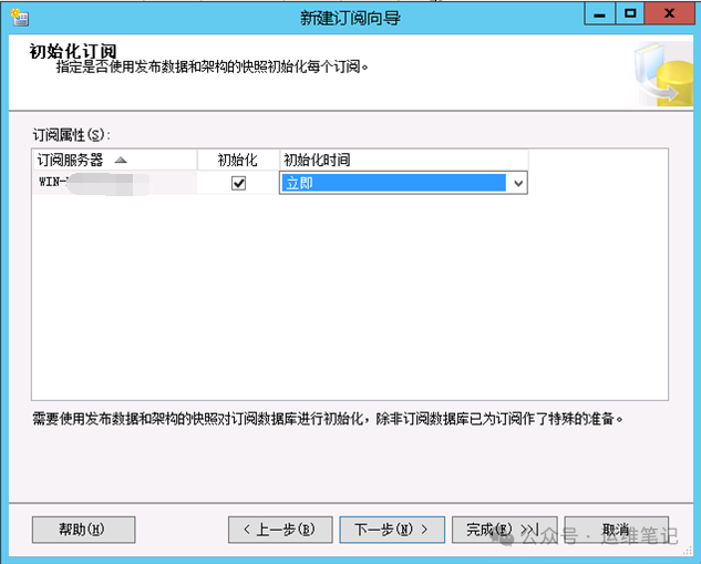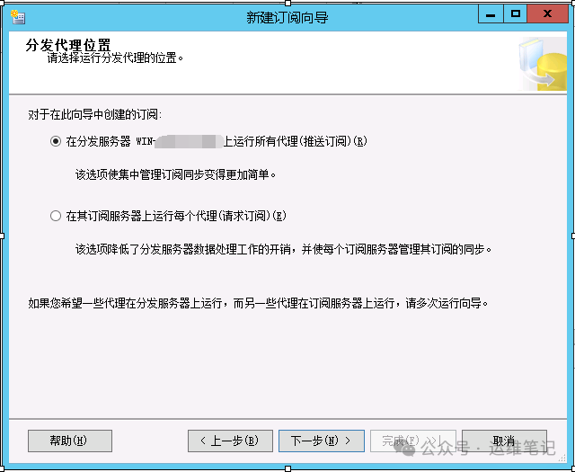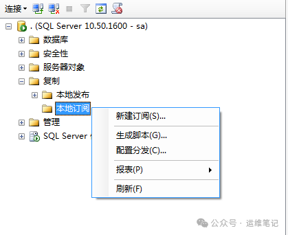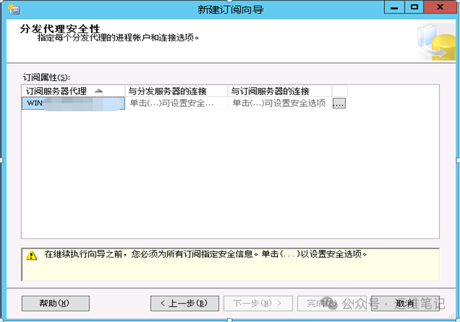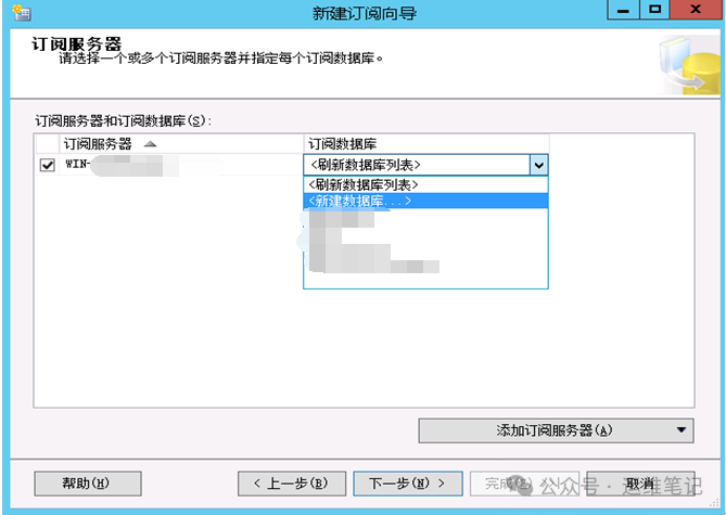 3 订阅部署3.1 新建订阅 右键点击【本地订阅】节点,打开,【新建订阅】对话框 3.2 订阅向导 1、弹出新建订阅向导点 2、击下一步,选择发布服务器,选择查找 SQL Server 发布服务器 3、弹出链接到服务器,链接到发布服务器。 注:不支持通过服务器别名、IP 地址等名链接,需用服务器实际名称进行链接 4、点击链接 ,选择要为其创建一个或多个订阅的发布,我们选择发布服务器 WIN-XXX 中的数据库发布 FaBu_TEST,然后点击【下一步】 3.3 分发代理位置在【分发代理位置】对话框中,选择第一项,点击【下一步】 3.4 订阅服务器在【订阅服务器】对话框中,选择新建数据库,或者提前建好一个新数据库选择这个数据库 3.5 分发代理安全性 1、在【分发代理安全性】对话框中,我们点击 “...”,进入安全性设置,我们选则的是 SQL 帐户 2、输入订阅服务器 SQL Server 的登陆名和密码 3.6 同步计划 点击【下一步】,设置代理计划,我们选择默认的 “连续运行” 3.7 初始化订阅 点击【下一步】,进入【初始化订阅】对话框,选择 “立即” 初始化 3.8 向导操作 1、在【初始化订阅】点击【下一步】:选创建订阅 2、点击【下一步】:完成向导 3、点击【完成】,就会创建订阅,并显示创建结果