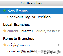 3.1.5、 代码合并代码合并是个技术活,这里提2个点 第一点是合并注意事项:1)、由开发人员发起合并,对于冲突比较多的,可以2个人以上进行合并;2)、系统参与者 评审人员 review通过后,才正式合并到分支。 第二点是合并方式:可基于命令行也可基于Idea git插件代码建立分支与合并分支。 以下基于Idea git插件方式进行代码合并说明: 3.1.5.1、建立分支git默认的主分支名字为master,一般团队开发时,都不会在master主分支上修改代码,而是建立新分支,测试完毕后,在将分支的代码合并到master主分支上。 操作如下1、idea git分支的操作idea git的操作在右下角,如下图: 说明: