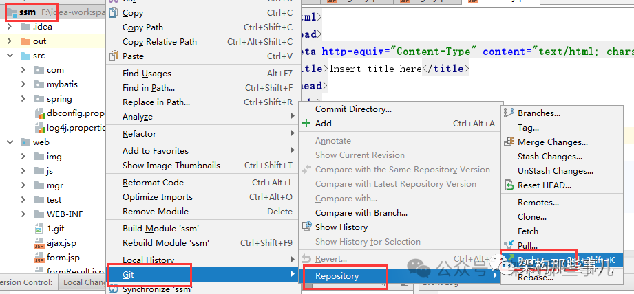 3)、推送到远程仓库操作如下图: 点击【push】 提交成功后右下角弹出信息: