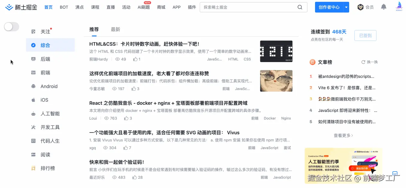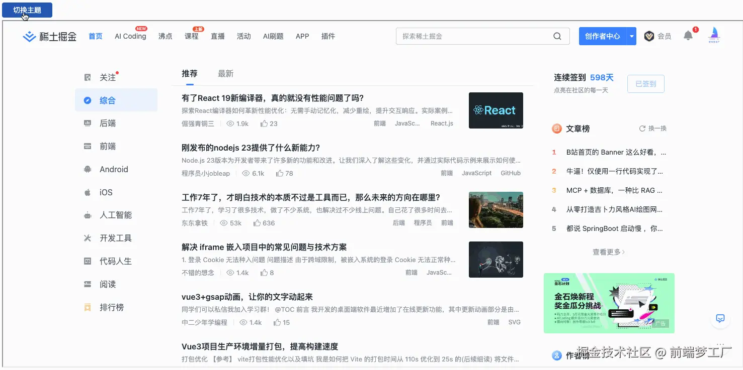 首先,先来看实现效果,以给掘金网站加入暗黑模式为例,暗黑版掘金网站效果如下: