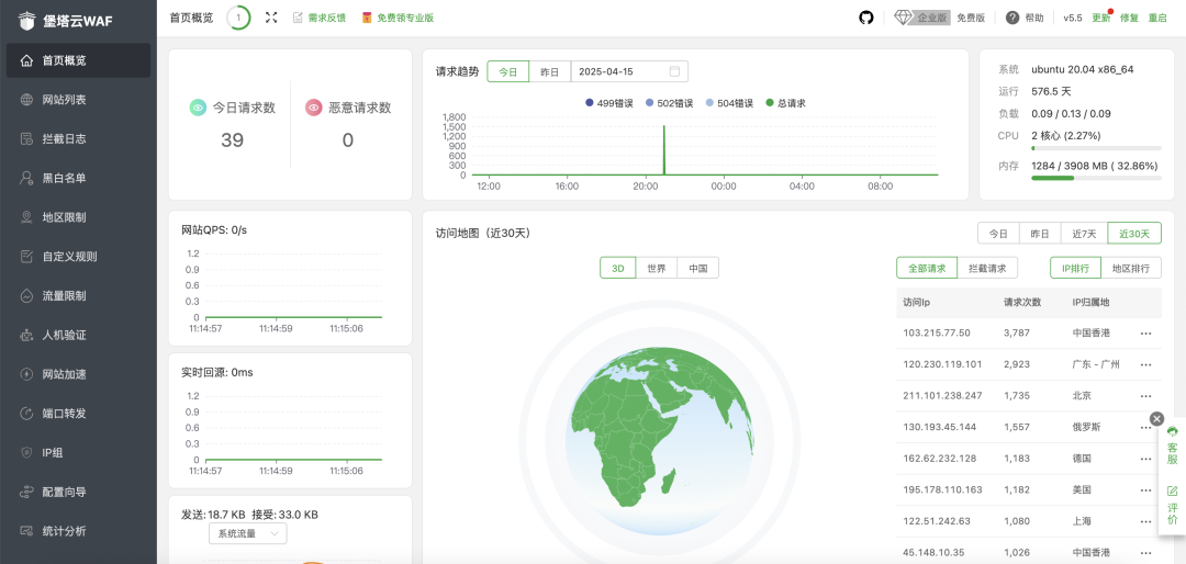 经常做站的小伙伴都知道,有时候打开自己的网站发现多了一些不可描述的弹窗甚至直接跳转到了一些不可描述的网站,又或者收到云厂商的告警通知,甚至倒霉一点的,网站直接被拦截封禁 而想要申诉又要准备大量的材料和走复杂的流程,如果你的网站有很多客户,那在你网站不能访问的日子里,你的客户又会何去何从? 与其事后亡羊补牢,不如事前做好加固防御,通过堡塔云WAF给网站加一层防御,避免因攻击而造成的损失。 堡塔云WAF是一款真正开源免费可商用的WAF防火墙,首个支持ARM国产系统的WAF防火墙,有超高自由度的自定义拦截规则和可灵活配置各种限制访问,有效防CC攻击、防恶意采集、防刷接口等常见攻击和黑客渗透测试行为,为您的业务网站保驾护航。 1️⃣全面防护 一键无忧 支持精准拦截主流Web攻击,智能识别CC攻击高频请求,秒级阻断SQL注入与XSS跨站脚本;严格过滤恶意文件上传,实时拦截远程命令执行及非法文件包含漏洞,并配备主动防御机制,有效对抗黑客工具扫描。无需复杂配置,全方位为您的业务穿上隐形防护甲。 2️⃣立体化漏洞防御 智能拦截网页挂马、后门程序上传等恶意代码渗透,同步防护Struts2、WordPress、Discuz、织梦/PHPCMS等常用开源程序的命令执行、SQL注入文件上传漏洞及FCKeditor编辑器高危风险,实时更新漏洞规则库,无需手动修复即可为Discuz、DedeCMS等主流框架披上防护盾,让老旧系统也能免疫新型攻击。 3️⃣合规防护双保险 自动拦截敏感数据泄露、配置错误等安全隐患;同步搭建防盗链“金钟罩”,精准识别非法资源盗用请求,一键开启Referer校验、动态加密防盗链策略,保障图片、视频等资源不被恶意劫持,助力企业轻松满足等保合规要求,安全与业务流畅兼得。 1️⃣安全态势一屏掌控 实时轮播今日总请求量、恶意攻击峰值、TOP攻击IP来源,动态展示SQL注入/XSS等攻击类型占比饼图,智能标记防护策略拦截效果(如CC攻击压制率98%),风险波动趋势线直观预警潜在威胁,让安全防护从「被动挨打」升级为「主动布防」,风险感知快人一步,防护效果透明可视! 2️⃣攻击拦截全流程可视 堡塔云WAF精准记录每次攻击的精确时间、目标网站、受攻击URL路径及攻击类型(如SQL注入/XSS),实时追踪恶意IP归属地(例:北京·阿里云),并自动生成可检索的拦截日志库,支持一键封禁高危IP或导出攻击详情,让黑客行踪无所遁形,威胁处置快准稳! 1️⃣在线安装 登陆服务器执行以下命令