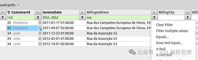 DbGate 提供了强大的数据浏览器和编辑器,可以快速查找和修改数据。用户可以直接输入过滤表达式(例如字段值包含的字符子串),或者通过菜单过滤数据。