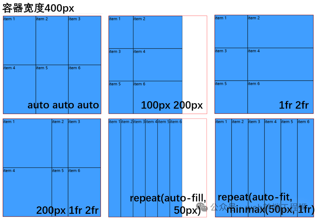 :单元格宽度不固定,容器宽度固定。会将空轨道折叠,让现有列尽量填充空间minmax()