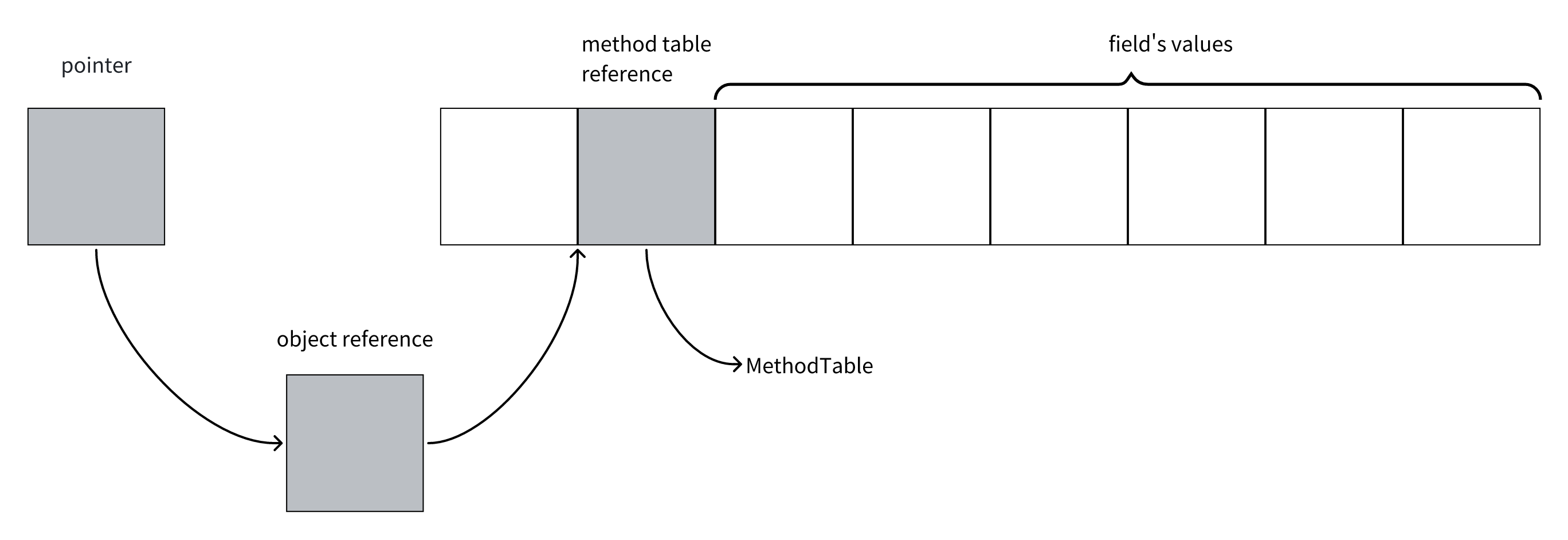 对象引用,也就是我们常说的引用类型变量,是一个类型安全的指针,指向引用类型实例的 MethodTable 指针,通过偏移和计算可以访问对象头和字段。