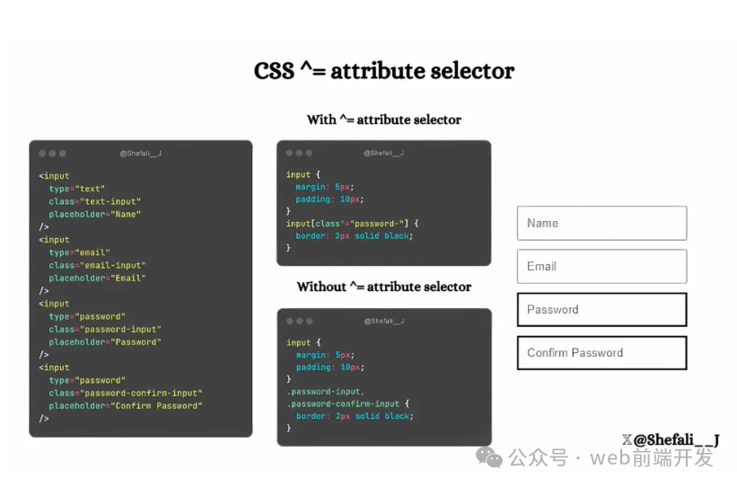 我们可以使用 ^= 属性选择器来选择指定属性值以特定字符串开头的元素。此选择器在处理具有动态或部分属性值的元素时尤其有用。