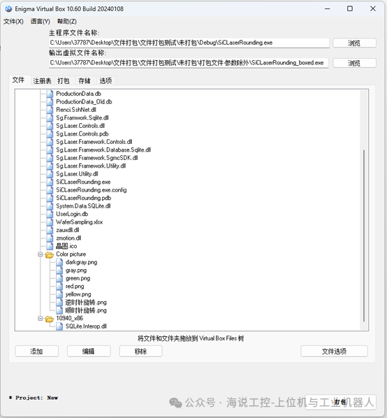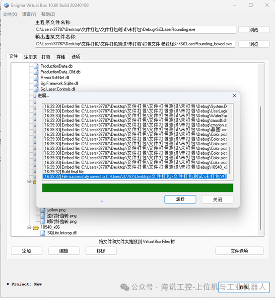 注意:使用Costura.Fody打包后,与该exe相关的关联dll文件会全部打包进去,但是本地数据库文件或其他参数配置文件不会被打包,需要将他们一同放入exe所在文件夹方能正常运行。 二、使用Enigma Virtual Box工具进行打包 1.选择主程序名称,设置输出虚拟程序名称 2.添加需要打包的附加文件或文件夹,如果有文件夹,需要先建立文件夹,再选择该文件夹添加文件夹中的所有文件 3.点击打包按钮,等待打包完成 4.视频操作案例 4.1使用Enigma Virtual Box工具完整打包含参数,这种打包方式会将所有文件包括参数打包到一个文件,参数修改后无法保存,因为软件关闭重开,又会恢复文件最初始的状态。