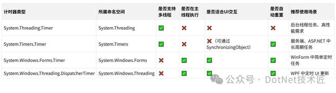 应用场景WPF 界面上定时刷新内容; 依赖 UI 线程的操作; 动画、倒计时等可视化组件任务。 定时器对比C# 中的四种 Timer 各具特色,适用于不同技术栈和开发场景: System.Threading.Timer:轻量高效,适合后台任务; System.Timers.Timer:功能丰富,适合多线程服务器开发; System.Windows.Forms.Timer:简洁易用,WinForm 界面首选; DispatcherTimer:WPF 环境下专属计时器,安全可靠。 选择合适的 Timer,不仅关系到程序的稳定性与性能,也直接影响用户体验。希望本文能帮助大家清晰掌握各个 Timer 的使用方法与最佳实践,在实际项目中游刃有余地应用。 阅读原文:原文链接 该文章在 2025/6/23 14:50:03 编辑过 |