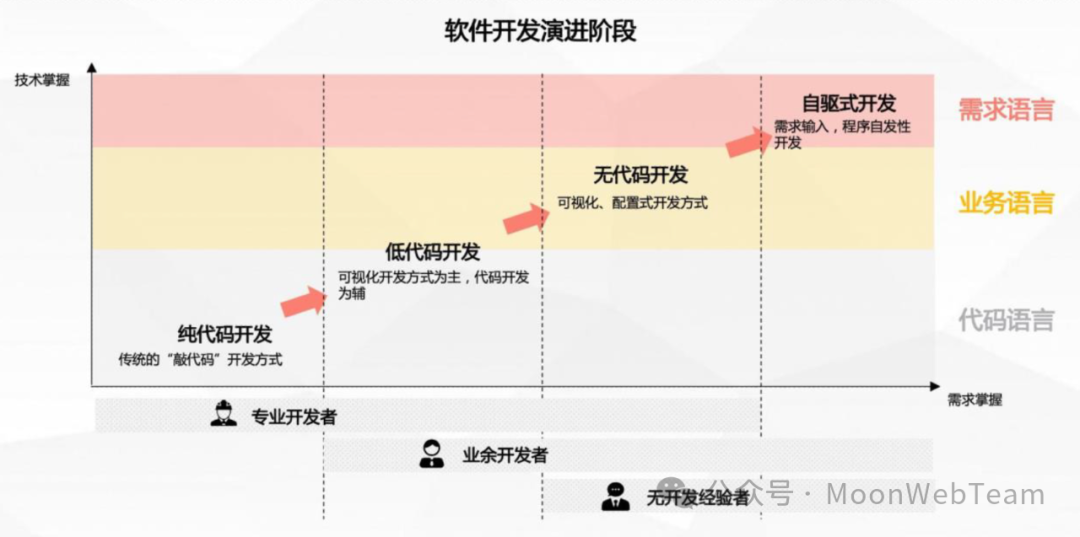 低代码的由来可以追溯到软件开发的演变过程。随着信息技术的快速发展,企业对软件应用的需求不断增加,传统的手工编码方式逐渐显得效率低下,难以满足快速变化的市场需求。 如果有研究过计算机程序语言发展史的同学,应该有听闻第一代编程语言 (1GL)到最新的第六代编程语言(6GL)的蓝图,每一代升级都是生产力的提升,到了第四代其实初见“低代码”的端倪。但是还没有正真提出“低代码”这一概念。 低代码概念需要借助低代码开发平台这一工具实现。维基百科将低代码平台定义为一种提供开发环境的软件,基于低代码平台开发者不需要使用传统的手写代码的方式进行编程,而是可以通过低代码平台图形化的用户界面和参数设置来创建应用软件。 低代码平台面向的用户群体是无需专业开发能力的企业业务人员和一部分专业开发人员。HR 、财务、销售等业务人员完全可以自己或者在技术 人员的指导下开发出更符合特定业务工作需求的应用程序,而专业技术人员则可通过可视化、流程化的开发方式,实现相比于纯代码模式更高效的开发。 单纯从这些公开的信息,其实也无法直观的了解啥是低代码,在笔者看来低代码不是一项具体的技术名称,它是一个技术领域的统称,是属于其中一种程序开发模式。 这个维度下,程序的开发模式可以分为三种:纯代码(Pro Code)、低代码(Low Code)、无代码(No Code) 纯代码(Pro Code)纯代码开发是指使用传统编程语言(如Java、Python、C#等)进行软件开发的方式。开发者需要具备编程技能,能够手动编写代码来实现功能。它的特点具有:灵活性 - 开发者可以完全控制代码的每一个细节,能够实现复杂的业务逻辑和功能;可扩展性 - 可以根据需求进行高度定制,适合大型和复杂的项目;学习曲线 - 需要较高的技术门槛,开发者需要掌握编程语言、框架和工具;维护性 - 代码的可读性和可维护性依赖于开发者的编码习惯和团队的规范。Pro Code 和 No Code 实际上都很好理解,一个是纯代码,一个是无代码。假设 Pro Code 的代码量是 100,那 No Code 就是 0,所以 Pro Code 和 No Code 是截然不同的,甚至你可以认为这两者毫无关系。No Code 的最典型形态莫过于 SaaS 类的产品了。 低代码跟无代码概念容易混淆,如果按照公式来表达的话: C,Configuration in graphical,图形化配置,这是大家对低代码最直观的认知部分。通过各类常规的UI手段,如窗口、对话框、文本框、下拉框等编辑器等UI交互形式引导用户表达信息。 A,Arrangement in graphical,图形化编排,基于图元或其他形式的节点信息,通过连接、排布等方式表达流程、时序等信息。 T,Textual DSL,文本型的DSL,借助某种文本化形式的特定领域语言做描述表达,可能为表达式或其他计算机语言,一般谈“低代码”中的代码指的主要是这部分内容。 低代码的构成公式 无代码的构成公式 低代码平台可以分为专用型和通用型两种 所谓通用,指的是开发平台不事先假设自身只能应用在特定的场景、业务、行业,而是具有广泛的适用范围。具有这样特征的开发平台往往需要有一个通用的底座。这个底座是纯技术性的,它不依赖于特定的业务功能,而只与业界广泛使用的标准协议、技术标准产生耦合。不过,这个时候,我们只有深入平台架构实现的细节,才能判断平台到底是低代码还是无代码,这就导致平台的使用者难以甄别。 但是,通用是有代价的,越通用就往往意味着在特定业务场景下的效率越低,越通用就意味着默认配置里的个性化信息越少,为形成某个具体场景所需的配置量就越大,从这个具体场景的角度看,效率相应也就越低。 所以通用型的低代码平台往往伴生着这个特征:有相对完善的有插件(或类似)机制。这一点相对来说比较好识别,相对高通用性的技术底座来说,插件是廉价的,因此通用性低代码平台往往会有数量众多的插件。这些插件可以定制出各式各样具体的业务场景,通过插件的定制化和扩展性来解决效率问题。 2.3. 按业务类型来分类 其实,在一个具有较高通用适用范围的低代码平台来说,按照业务类型分类几乎是没有意义的。之所以不得不按输出程序类型分类,是因为开发平台的通用性不足,而在有了足够高的通用适用性之后,支持开发各种类型 App 的问题,就不在于能不能了,而只是时间问题。 按照业务类型区分大概有流程驱动型、表单驱动型、模型驱动(ORM)型、BI 分析、组件驱动类型这几种,具体你可以看看这张表格(5 星为满分): 这里,主要区分一下表单驱动型和模型驱动型这两个类型,因为它们比较容易混淆。 所谓模型驱动型 App,它的模型指的是数据模型,或是数据关系。而这里所说的关系,指的就是符合三范式的关系型数据库的关系,也就是你数据库中各个数据表之间的关系,比如表 1 的 a 字段和表 2 的 a 字段是相同的,但与表 3 中的 a 字段没有关系。在正确配置了各种数据关系之后(这个过程一般称为数据建模),页面上就可以很容易创建各种 CRUD(增删改查)类页面了。 表单类页面则是仅以数据为中心,创造各种表单来收集或呈现数据。这里的关键点在于,这类页面并不关注数据之间的关系。所以表单类的页面非常容易形成数据孤岛,并存在大量冗余数据,以及大量数据不一致性等问题。如果我们将表单类页面做得比较完善的话,实际上它就会逐渐转型成模型驱动类页面了。在完成数据建模之后,我们就分
