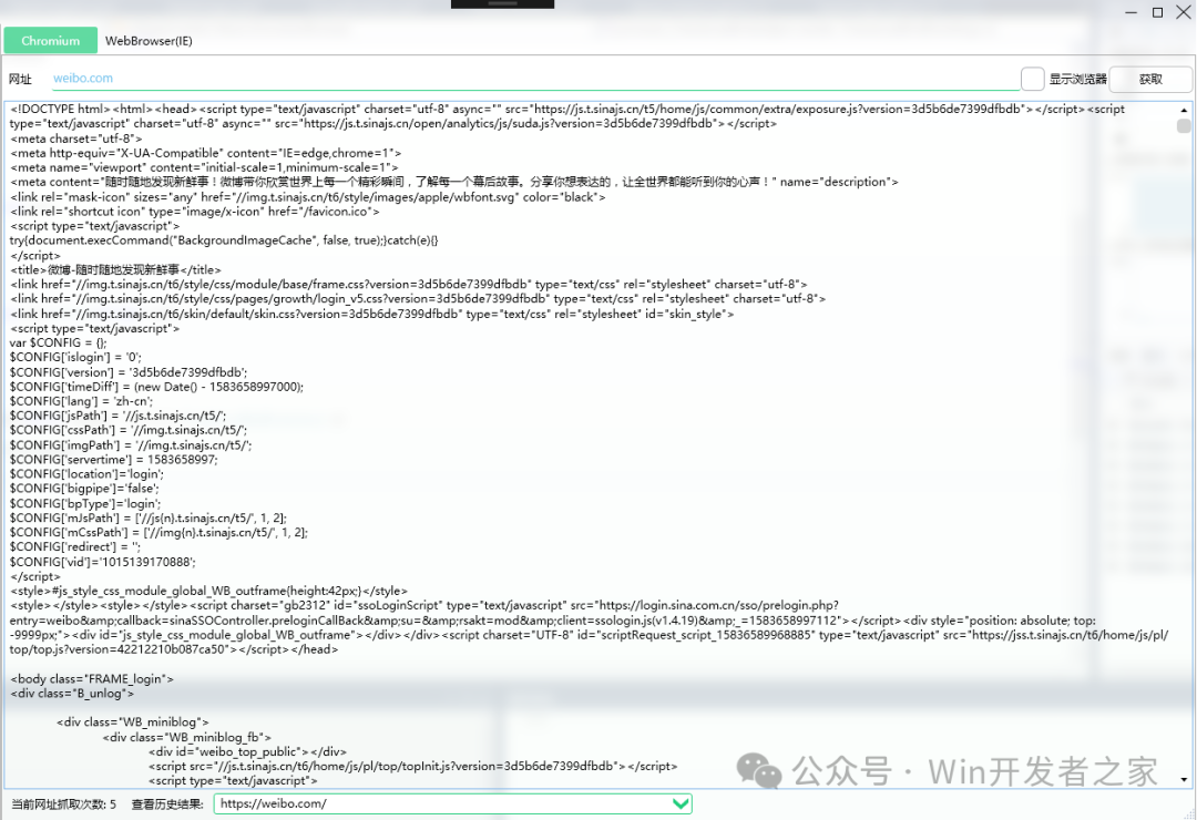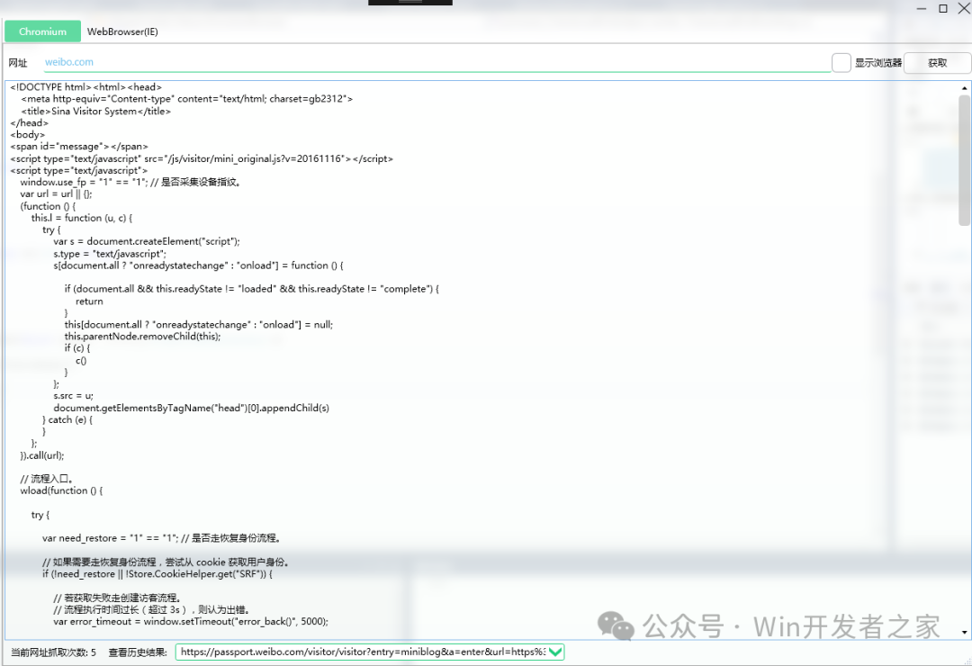 5、处理获取到的网页源码 在ChromiumWebBrowser.FrameLoadEnd事件实现里可以获取到网页的动态源码。 这里需要注意的是,当你打开一个动态页面,这个事件可能 会触发多次, 比如你打开weibo.com,这个事件就会触发多次。 1 private async void Chrome_FrameLoadEnd(object sender, FrameLoadEndEventArgs e) 2 { 3 string source = await chrome.GetSourceAsync(); 4 }