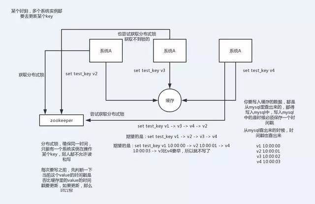 假设系统B先抢到锁,将key1设置为{ValueB 7:05}。接下来系统A抢到锁,发现自己的key1的时间戳早于缓存中的时间戳(7:00<7:05),那就不做set操作了。 3.什么是分布式锁 因为传统的加锁的做法(如java的synchronized和Lock)这里没用,只适合单点。因为这是分布式环境,需要的是分布式锁。 当然,分布式锁可以基于很多种方式实现,比如zookeeper、redis等,不管哪种方式实现,基本原理是不变的:用一个状态值表示锁,对锁的占用和释放通过状态值来标识。 关于分布式锁可以查看:分布式锁的实现原理与应用场景详解 03 — 第二种方案:利用消息队列在并发量过大的情况下,可以通过消息中间件进行处理,把并行读写进行串行化。 把Redis.set操作放在队列中使其串行化,必须的一个一个执行。 这种方式在一些高并发的场景中算是一种通用的解决方案。 阅读原文:原文链接 该文章在 2025/7/1 23:52:44 编辑过 |
