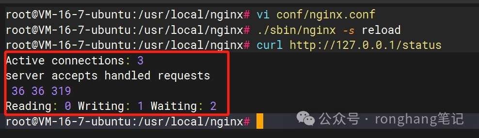 - ngx_http_stub_status_module模块提供对连接状态信息的监控,默认安装未包含此模块。