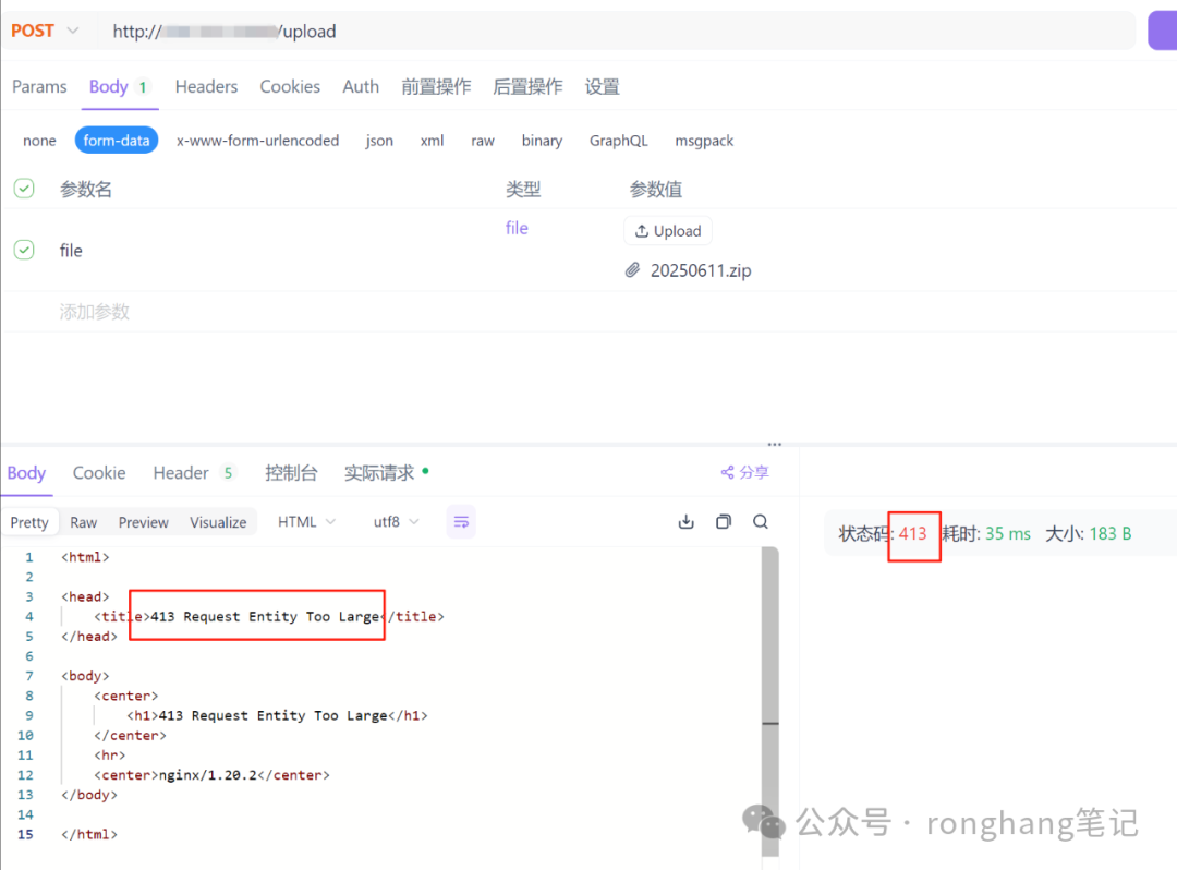 上传文件超过 client_max_body_size 默认大小1M,返回413