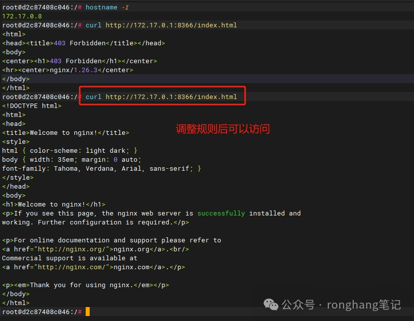 后禁止访问。而172.17.0.7能够访问是因为allow 172.17.0.0/16;规则生效。allowallow 172.17.0.0/16;