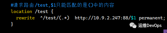 从上图看出,当请求路由为/test,实际是跳转到了httpd根路径下的test目录的index.html文件,为什么会这样呢?因为rewrite中的正则(.*) 前面并无其他内容,因此此时匹配的就是上面的路由test,而$1正好对应的是(.*)的内容,因此实际请求路径就变成了10.9.2.247:88/test注意:在rewrite的正则中,如果有$1、$2,那么实际匹配的是()中的内容,比如: