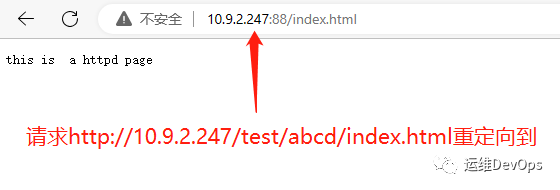 此时通过浏览器请求http://10.9.2.247/test/index.html,将跳转到httpd默认路径下的index.html,因为$1只能匹配括号的内容,此时(.*)匹配的内容就是index.html,因此实际重定向的路径就是http://10.9.2.247:88/index.html,^/test表示匹配以test开头的路由,location中是test,这里匹配的开头也要是test,不能所以写,会报错