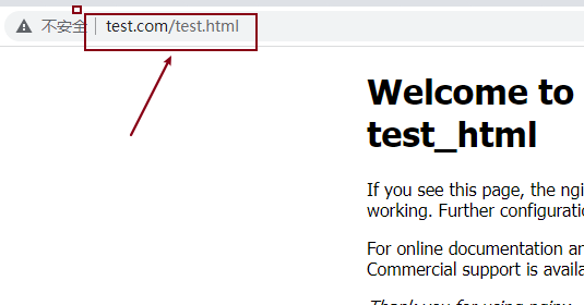 二、验证: 1、精确匹配: 在conf.d文件夹下创建配置文件test.com.conf,内容如下: 上图中第一个和第二个location匹配条件一样,都是/test.html,但第二个为精准匹配到静态路径,因此第一个不会执行,会执行第二个,www.test.com为本地域名解析,access_log和error_lor可以单独为每个模块定义日志 通过域名和路径访问后的内容如下: 注意:路径/usr/share/nginx/test_html文件夹下需要有test.html才可以正常访问 上图中指定静态资源路径用的关键字root,还可以用alias,那么root和alias的区别是什么?