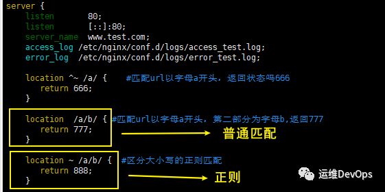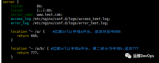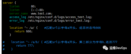 如上图中所示,请求的条件为test.html,通过root指定的路径为/usr/share/nginx/test_html,因此在匹配的时候,这个路径下就必须要有test.html这个文件才可以,否则就会找不到而报错,如果用alias,那么通过浏览器进行请求的时候,alias也是指定到/usr/share/nginx/test_htm路径下,但是会匹配默认的index.html,而无须强制匹配test.html,但是此时就不能使用”=”来进行精确匹配,现在将root改为alias,如图: 注意:alias指定的路径结尾要加”/” 下面的配置文件采用roo指定路径,当通过域名请求http://www.test.com/html/的时候,将跳转到/usr/share/nginx/html/下的index.html页面,如图: 下面的配置文件采用alias指定路径,请求http://www.test.com/linshi/的时候,将跳转到/usr/share/nginx/test_html/index.html页面,如图: 2、通过^~方式实现匹配: 例如:下面配置文件有两条规则,分别匹配url以字母a开头,但是长度不同,首先将长的规则先注释掉,如图: 通过curl请求查看状态码,如图: 说明:当前只有一个规则开启,因此当匹配url以/a/开头的任何url时,都会返回状态码666 现在将第二条规则注释取消,打开规则,如图: 再次发起同样的请求,观察返回状态码,如图: 从上图可以看出,两条规则同时被匹配成功,但是第二条规则比较长,因此第二条规则优先被匹配,如果^~匹配成功了,那么表示阻断正则表达式,不再进行正则匹配 3、通过”~”方式实现匹配: 上图中的匹配规则都是通过”^~”方式来实现的,那么在匹配最长规则的时候又分为两种情况: