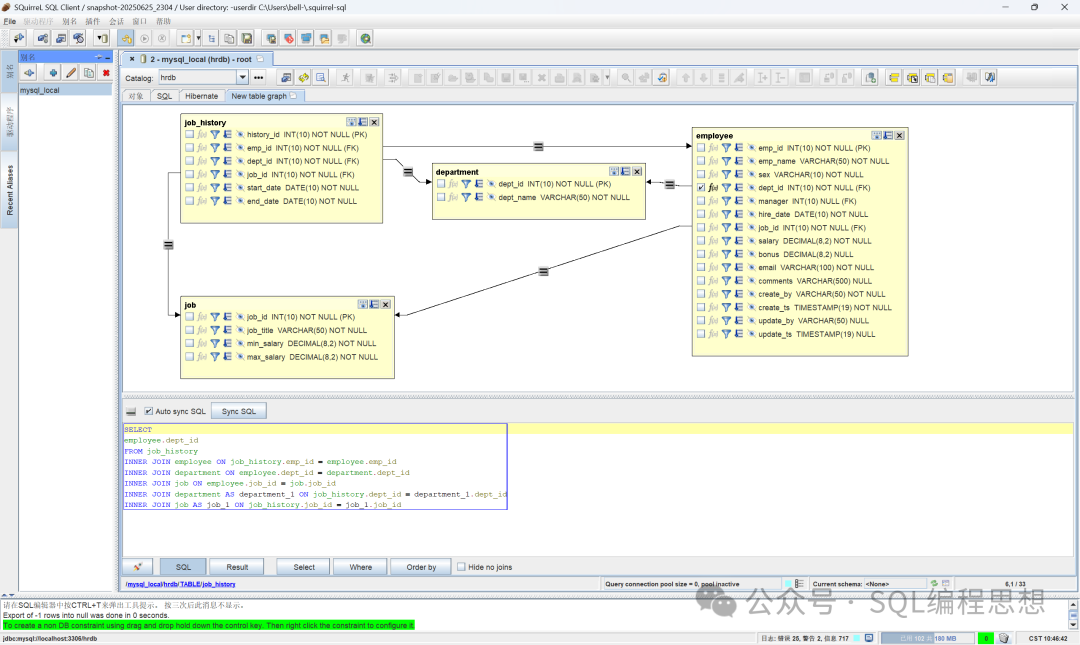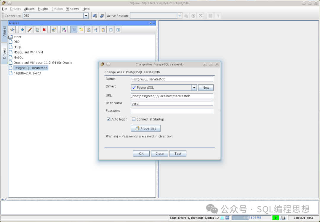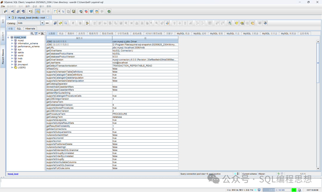 SQuirreL SQL 是一个免费开源、基于 Java 的 通用 SQL 客户端。它提供了一个统一的界面,让数据库管理员(DBA)、开发人员和分析师能够轻松地连接、查询和管理多种不同类型的关系型数据库。 SQuirreL SQL 支持 Windows、Linux、macOS 操作系统。 数据库支持SQuirreL SQL 最大的优势之一是它通过加载相应的 JDBC 驱动程序来连接数据库,因此只要数据库提供 JDBC 驱动,理论上就可以通过它进行连接。 常见的数据库包括 PostgreSQL、MySQL、MariaDB、Oracle、Microsoft SQL Server、 Db2、SQLite、H2、HSQLDB、Apache Derby、Firebird、Sybase ASE、Informix、 Amazon Redshift,、Snowflake、Apache Hive、Apache Impala、Vertica、Teradata 等。 对象浏览器:SQuirreL SQL 以树形结构直观地浏览连接的数据库对象:数据库、表、视图、存储过程、函数、序列、索引、触发器等。 右键菜单提供常用操作:查看数据、生成 SELECT/DROP/CREATE 脚本、重命名、导入/导出数据等。 SQL 编辑器SQuirreL SQL 编辑器支持语法高亮(多种数据库方言)、代码自动补全(对象名、关键字、函数)、执行 SQL 语句或脚本、查看执行计划(EXPLAIN)、查询结果分页显示、查询结果导出(CSV、Excel、XML、JSON、SQL)、查询历史记录等功能。 扩展插件SQuirreL SQL 实现了一个插件系统,支持通过插件扩展功能,例如 Graph Plugin 可以构建数据库实体关系图,并且可以通过图形化的方式创建查询语句。 其他常用的插件包括数据导入、数据复制、Hibernate 脚本、跨数据库查询、SQL 标签以及各种特定数据库扩展功能等。 下载安装SQuirreL SQL 基于 Java 运行环境,使用以下命令验证是否安装 Java: